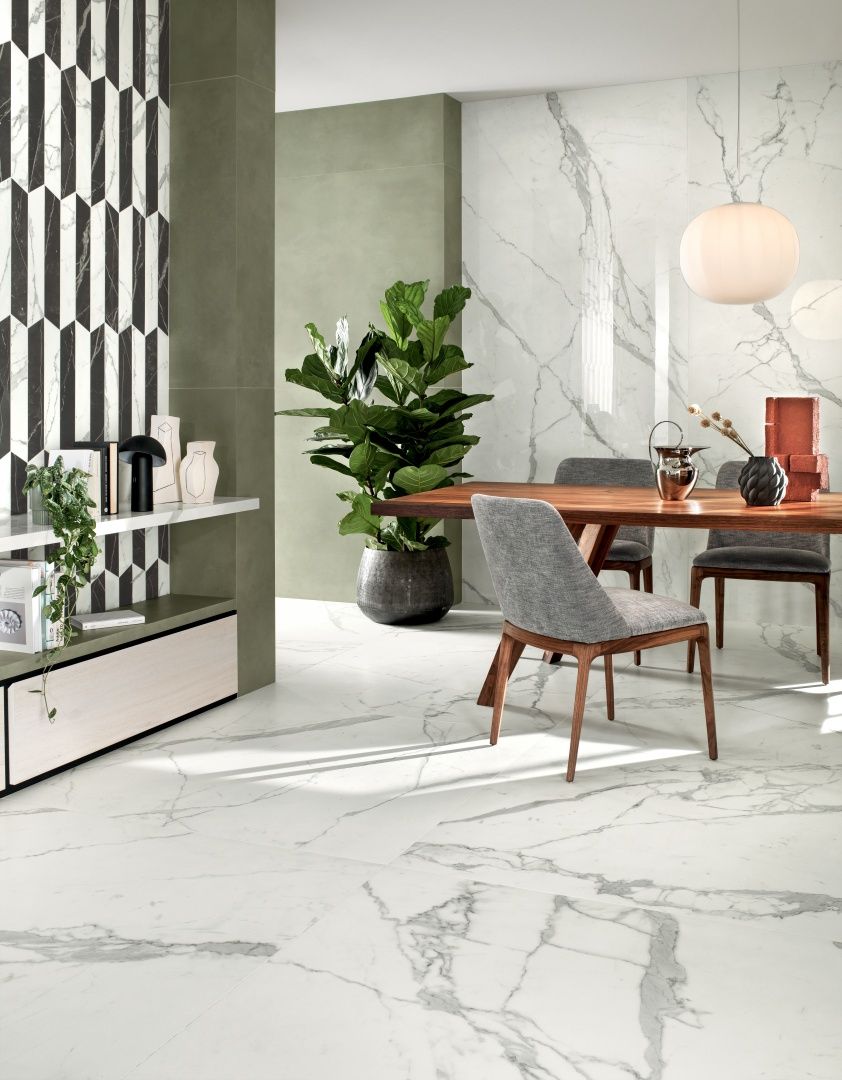 Коллекция Scultorea от Marca Corona вдохновлена утончённой эстетикой каррарского мрамора и очарованием Апуанских Альп, предлагая керамогранитные плитки с выразительными прожилками и широкой палитрой оттенков – от белого до серого и насыщенного чёрного.